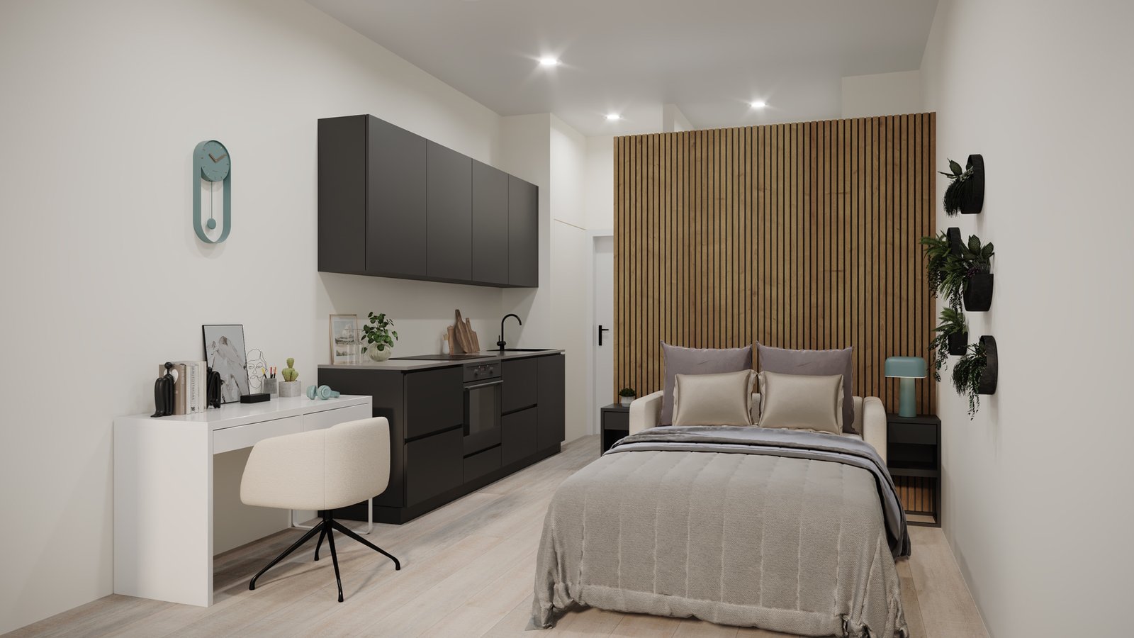 Elke studio is slim ingedeeld en voorzien van een eigen keuken, moderne badkamer en een handige bed-/bankcombinatie voor optimaal ruimtegebruik. Vanuit je studio geniet je bovendien van een prachtig uitzicht over de stad.